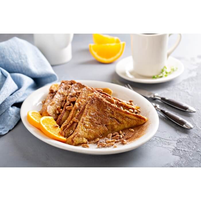 - Sumerja cada rebanada de pan en la mezcla de crema pastelera y déjelas remojar 30 segundos por cada lado. Colóquelas en una bandeja para hornear y déjelas reposar de 1 a 2 minutos.