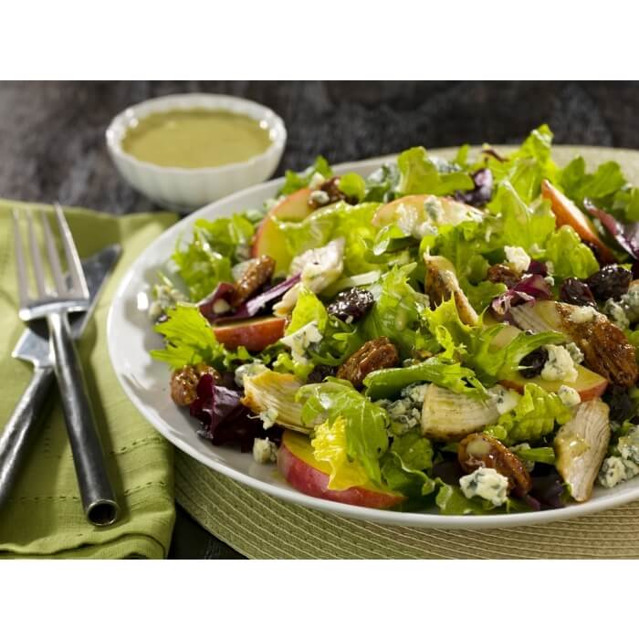 - 6 onzas de mezcla de ensalada (mezcla de lechuga romana y verduras de hojas verdes) 1 onza de vinagreta de manzana Granny Smith cremosa (vea la receta a continuación) 4 a 5 oz de pechuga o muslo de pollo deshuesado asado o a la plancha (rebanado y servido caliente) 5 o 6 rebanadas de manzana Fuji 1 1/2 onzas de queso azul grande desmenuzado 1 onza de nueces pacanas confitadas (receta en la página 16) 3/4 onza de cerezas secas 1/3 taza de Saborizante de Manzana Granny Smith Monin 1/4 taza de vinagre de sidra de manzana 1/4 taza de aceite de oliva extra virgen 1/4 taza de mayonesa 1 1/2 cucharadita de mostaza de Dijon 1 cucharadita de canela molida 1/2 cucharadita de sal kosher pizca de pimienta de cayena
