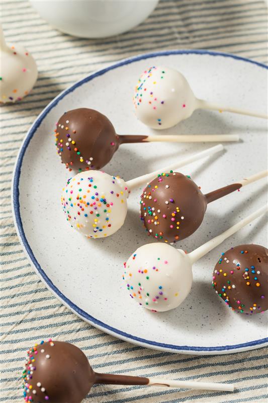 - Añade palitos a cada bola y decora a tu gusto con chocolate derretido y chispas y guarda en el refrigerador.