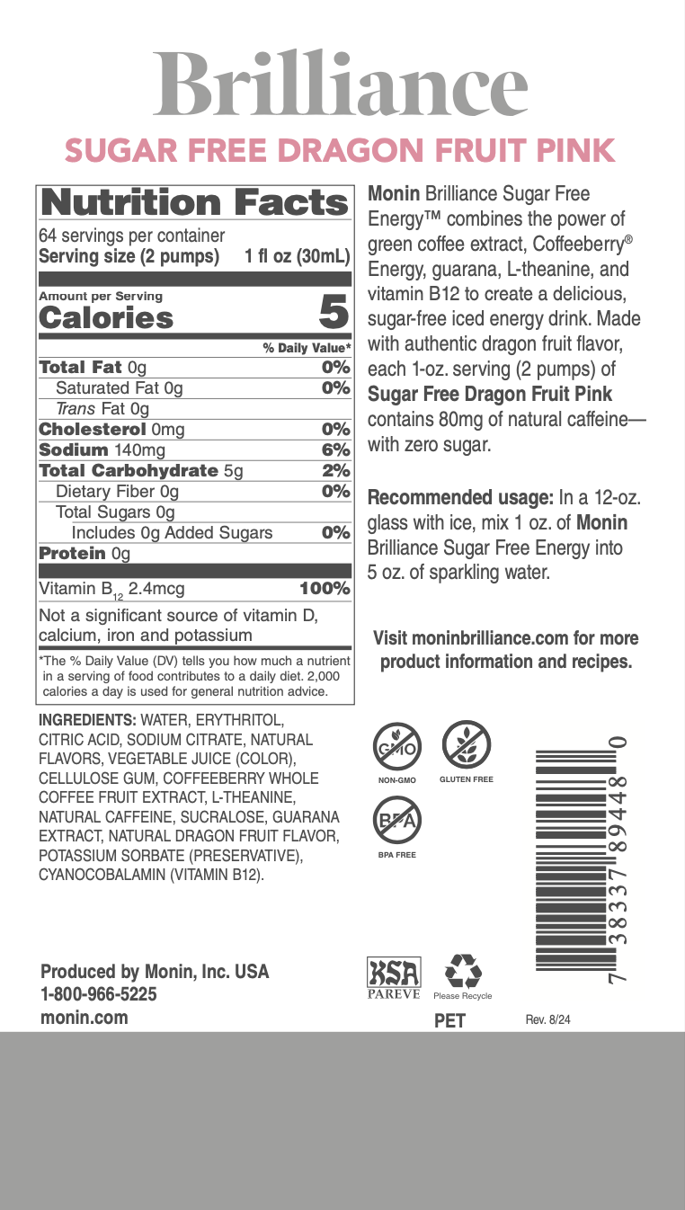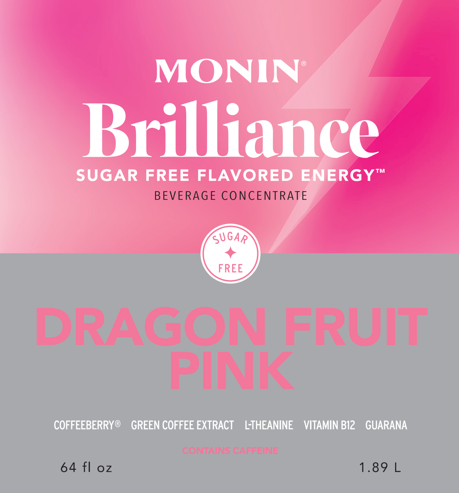 Agua, eritritol, ácido cítrico, citrato de sodio, sabores naturales, jugo de vegetales (colorante), goma de celulosa, extracto de café integral CoffeeBerry, L-teanina, cafeína natural, sucralosa, extracto de guaraná, sabor natural a fruta del dragón, sorbato de potasio (conservante), metilcobalamina (vitamina B12).