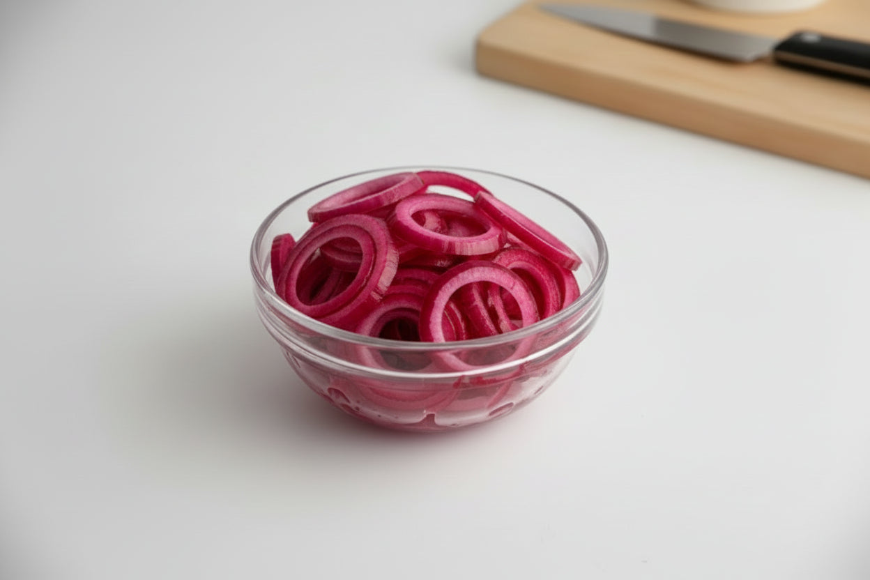 - Añadir las rodajas finas de cebolla morada a la mezcla de vinagre.