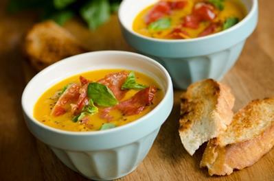 Para servir, corte o rasgue el prosciutto en tiras finas y vierta 2 onzas de puré frío en un vaso de chupito u otro recipiente pequeño. Adorne con tiras de prosciutto crujiente y hierbas a elección.