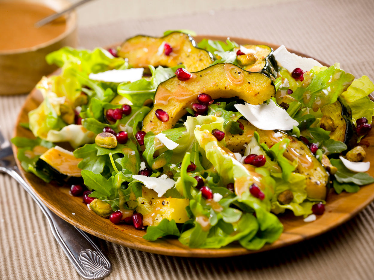 En una sartén grande, tueste los pistachos a fuego medio bajo, revolviendo ocasionalmente, hasta que estén fragantes, aproximadamente 5 minutos. Espolvoree con azúcar morena; revuelva para cubrir. Coloque sobre un trozo de papel vegetal y deje enfriar. Caliente las rodajas de calabaza asadas en el horno hasta que estén apenas calientes. Coloque dos o tres rebanadas en el plato para servir. En un tazón grande, mezcle las verduras con 2 onzas del aderezo de calabaza con especias preparado, agregando más aderezo según lo desee. Agregue la mitad de las semillas de granada y la mitad del queso; mezcle. Coloque la mitad de la mezcla de ensalada encima de las rodajas de calabaza en el plato. Disponga las rebanadas de calabaza restantes arriba de la ensalada y cubra con la mezcla de ensalada restante. Espolvoree con los pistachos confitados, el queso y las semillas de granada restantes. Sirva inmediatamente.